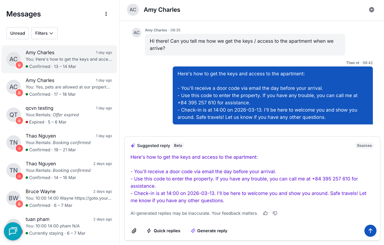 Cuando recibes un mensaje, puedes usar Generar respuesta con IA para crear una sugerencia de respuesta basada en la información disponible para esa conversación en Your.Rentals.